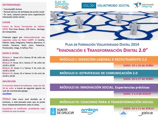 Los días 3 y 4 de julio el Programa de Voluntariado Digital, impulsado por la Agencia para la Modernización Tecnológica de Galicia (Amtega) y la Dirección General de Juventud y Voluntariado, celebran el III módulo de su Plan de Formación 2014 bajo el título “Innovación Social. Experiencias prácticas”.