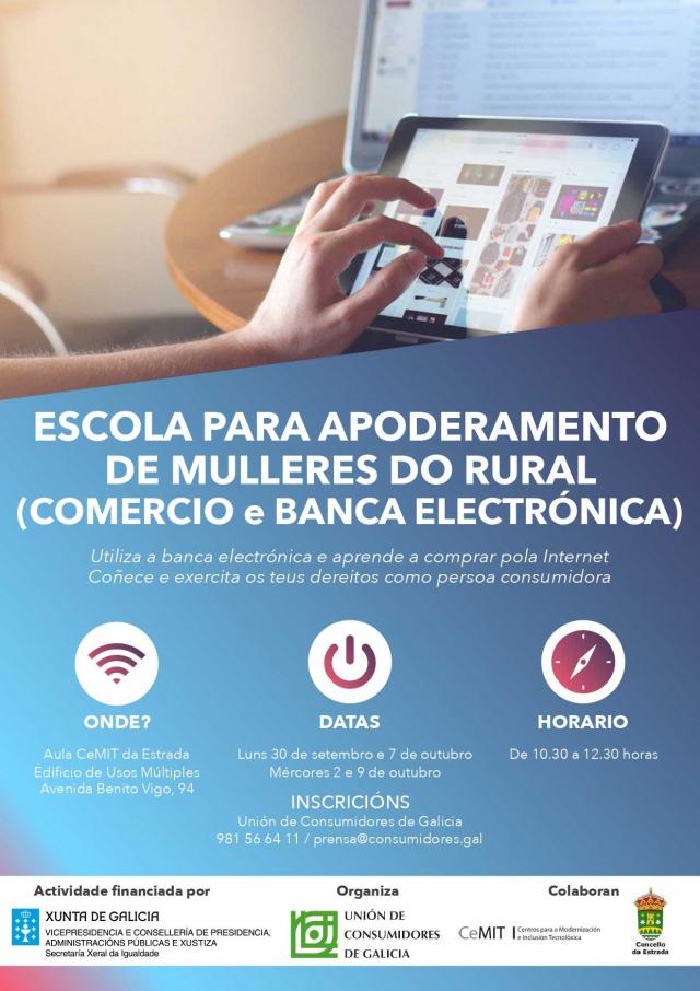 A Escola para o apoderamento de mulleres do rural: comercio e banca electrónica é unha aposta pola formación en novas tecnoloxías co fin de diminuír a fenda dixital, fomentar o apoderamento financeiro e a autonomía económica nun contexto no que o número de oficinas bancarias diminúe progresivamente e no que as transaccións de bens e servizos a través da rede están á orde do día. Entre os obxectivos destes obradoiros de formación está que as asistentes adquiran coñecementos e habilidades relacionadas coa Sociedade da Información (banca electrónica, comercio electrónico) e , así mesmo, coñezan os seus dereitos como persoas consumidoras e as ferramentas existentes que permiten o exercicio dos mesmos. UCGAL e a Secretaría Xeral de Igualdade colaboran por primeira vez nun proxecto que busca facilitar a participación das mulleres no entorno dixital e reforzar as súas competencias neste eido ao fin de facelas partícipes dos avances que proporciona a sociedade da información.