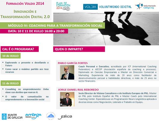 Esta semana chega ao seu fin o Plan de Formación VolDIX 2014 “Innovación e Transformación Dixital 2.0”, no que este ano xa levan participado máis de 150 persoas voluntarias. Hoxe e mañá, venres 11 de xullo, pecharase este programa formativo con dúas xornadas sobre o coaching como ferramenta para que as personas acaden as súas metas e desenvolvan as súas habilidades para a transformación e a innovación social.