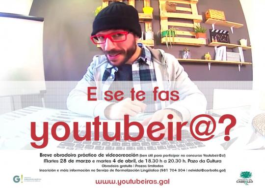 Youtubeir@s, como lembraremos, é unha iniciativa dos servizos de normalización lingüística (SNL) dos concellos da Baña, A Coruña, Ames, Carballo, Mazaricos, Ourense, Pontevedra, Ribadeo, Santiago de Compostela, Teo e O Grove; e tamén das universidades da Coruña, Santiago de Compostela e Vigo. O proxecto ten tres piares fundamentais: a procura de youtubeiras e youtubeiros, a formación para quen queira selo, e un concurso para incentivar que se fagan vídeos de titoriais e opinións en galego na Rede, con 4.000 euros en premios, e co prazo de inscrición aberto até o 28 de abril.